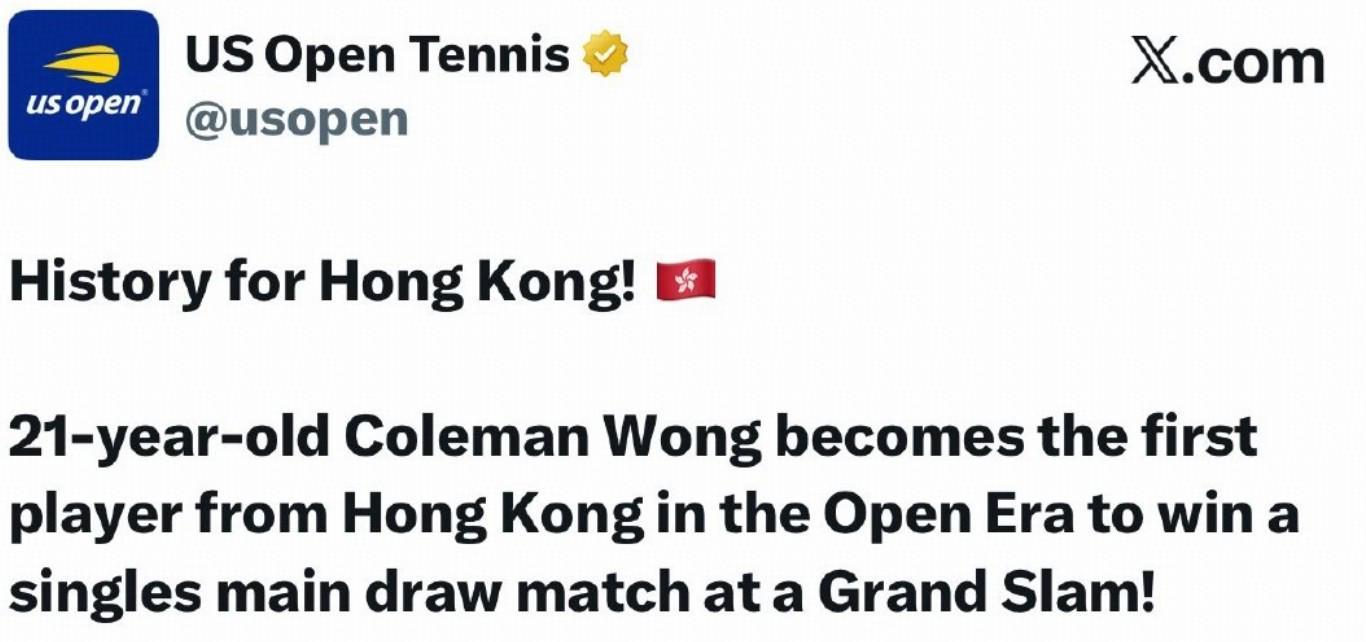 美网官方起初在社媒写道:“黄泽林成为第一名他的国家在公开赛年代取得大满贯胜利的选手。”但在不久之后,文案中的“his country”修改为了“Hong Kong”。