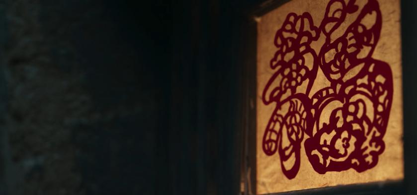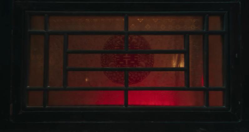在新婚夫妻圆房之时,镜头转到了贴着喜字的窗户。