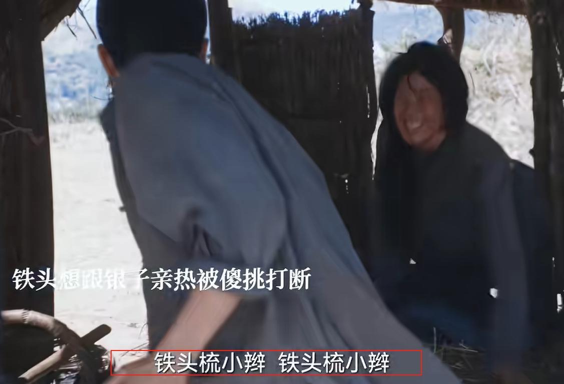 而当银子来窝棚找铁头,铁头想对银子动手动脚时,傻挑也会一边念叨着“铁头梳小辫”一边朝着铁头扑过去。